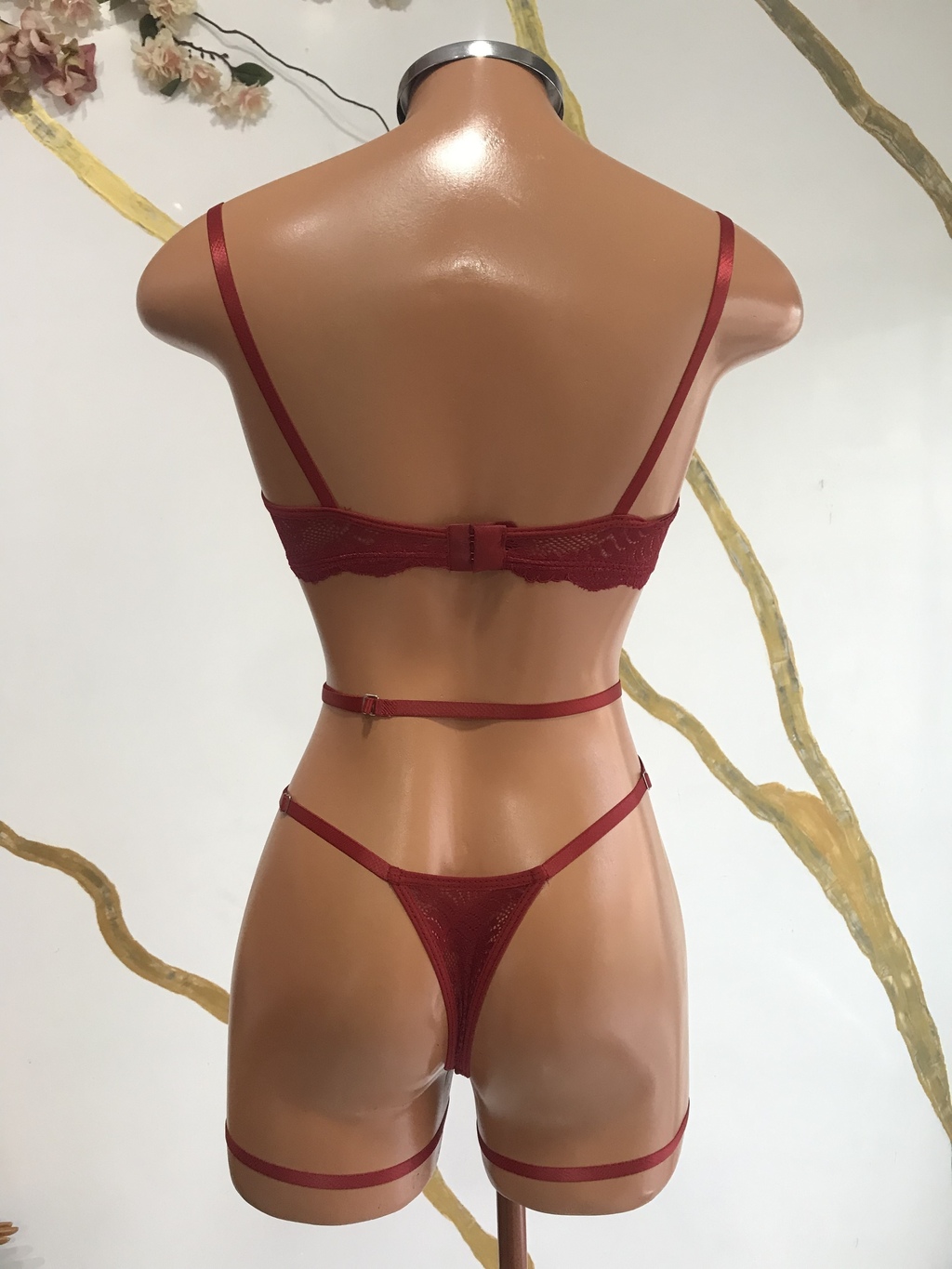 A calcinha fio, com reguladores laterais e coração central, é puro charme! E para completar, uma cinta de perna tradicional que vai deixar você se sentindo uma verdadeira musa!