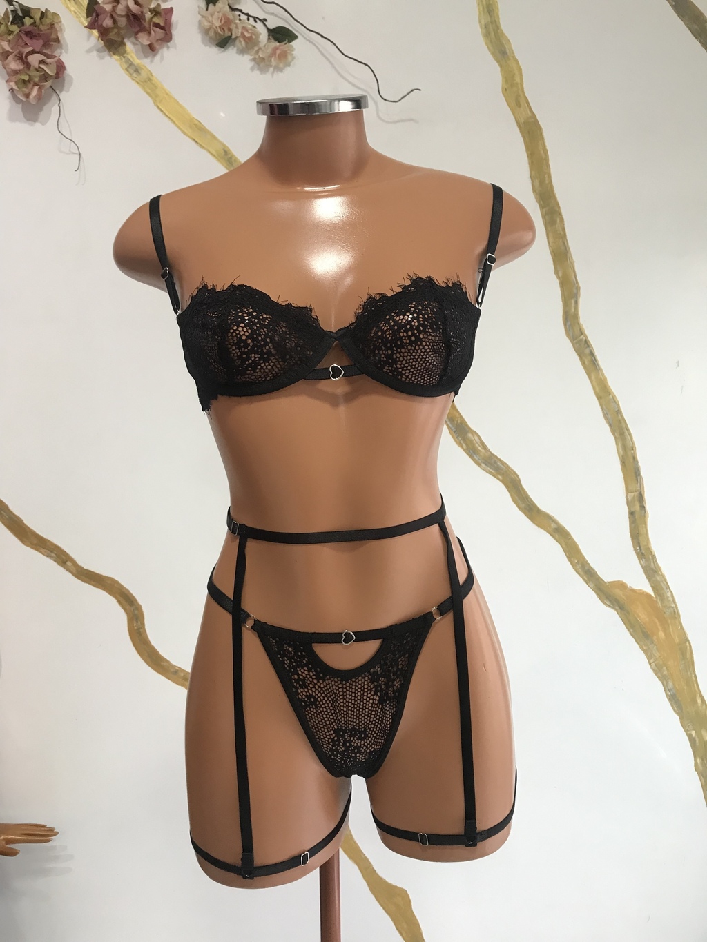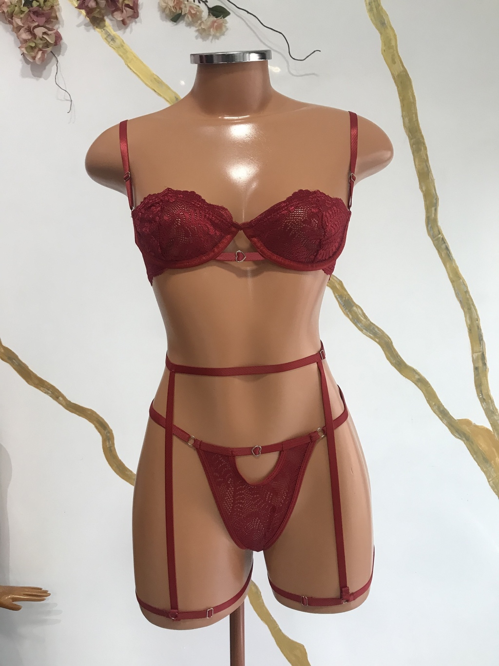 Se você está pronta para arrasar, o Conjunto Cris é a sua nova arma secreta! Com um sutiã estilo meia taça, sem forro e com aro de sustentação, ele tem detalhes vazados de dar inveja e um coração entre os seios que vai derreter corações! ❤️