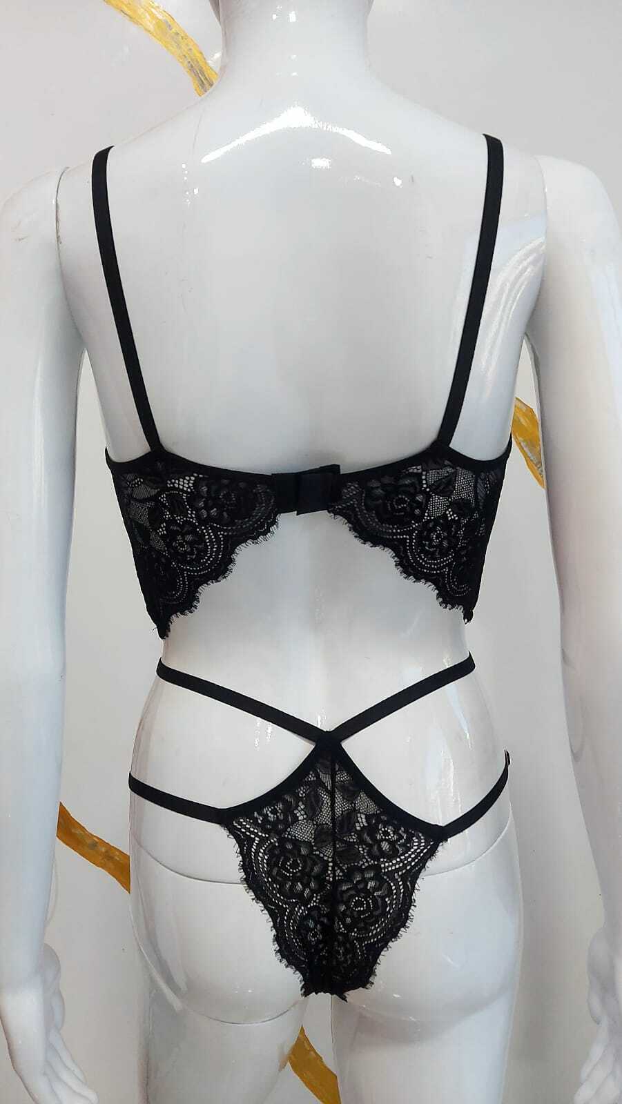 Conjunto composto por um cropped estruturado forrado, com aro, recortes e alças reguláveis e uma calcinha com 4 alças ajustáveis.